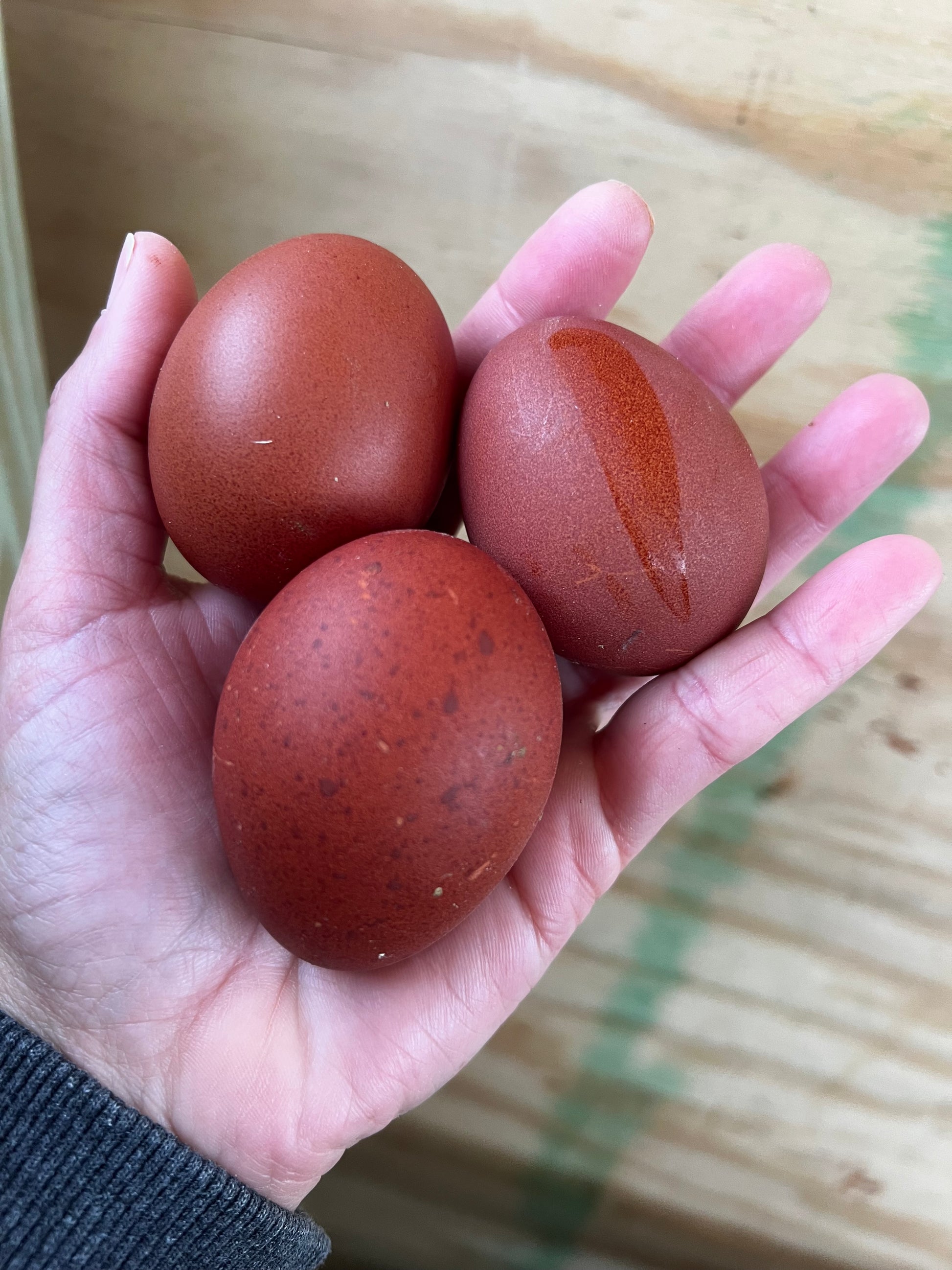 Black Copper Marans are known for their dark chocolate eggs. Marans will ALWAYS lay their darkest eggs at the beginning of a lay cycle. The longer they lay- the lighter the eggs will be. We do not "hold back" the darkest eggs for ourselves. We will ship the eggs that are laid in a 48 hour period. I post tons of pictures of our BCM eggs, usually right after I grab them from the nest boxes on my FB page. Some days they will lay super dark and some days they withhold some of that dark rich ink! Remember, the rooster is 50% of the genetics that will play a role in the egg color. Our Marans are friendly and calm. The Roosters are well behaved and people friendly. Some of our Marans lay a pink bloom.