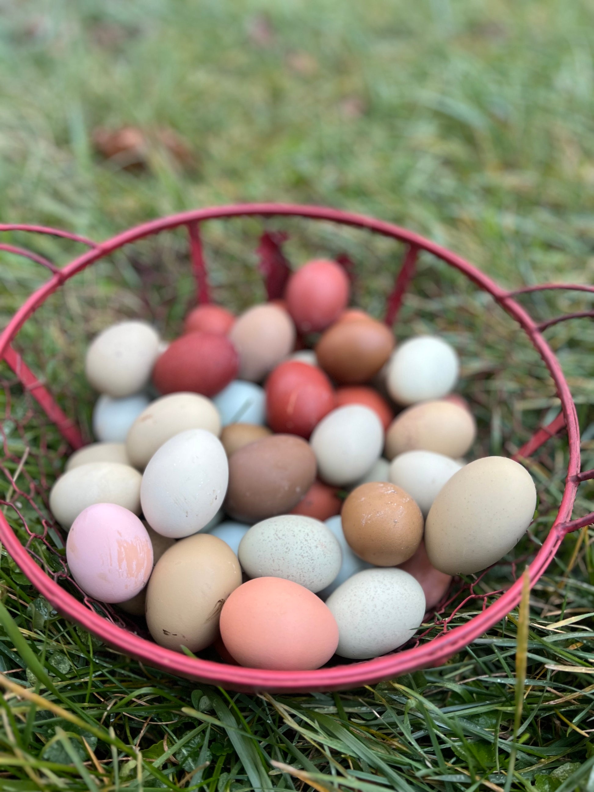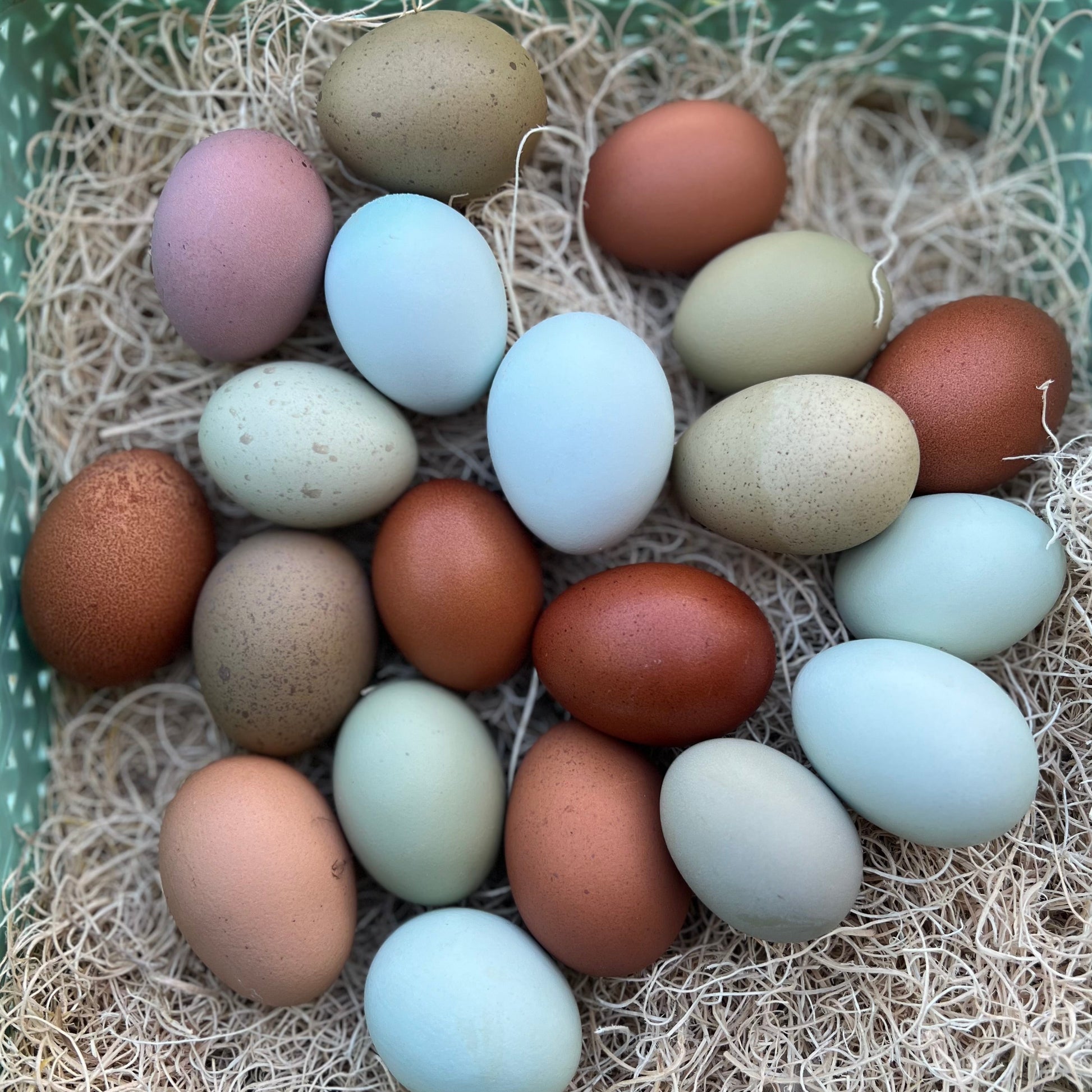 We love a good mixed dozen! Our Rainbow Mix may have eggs included from our Ameraucanas, Olive Eggers (Back-Crosses also) Welsummers, Silverudd's Blue, Black Copper Marans, Legbars and Fibro Easter Eggers depending on availability.